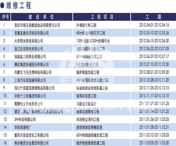 宏順建設工程有限公司是國家批準成立的專業高空作業企業:承攬過(國內.國外)煙囪新建、煙囪防腐、磚煙囪新建、煙囪改造、煙囪維修、煙囪脫硫防腐、煙囪拆除加高、煙囪滑膜等高空作業工程。具有“不搭腳手架 、 不需要停產”施工特點。
